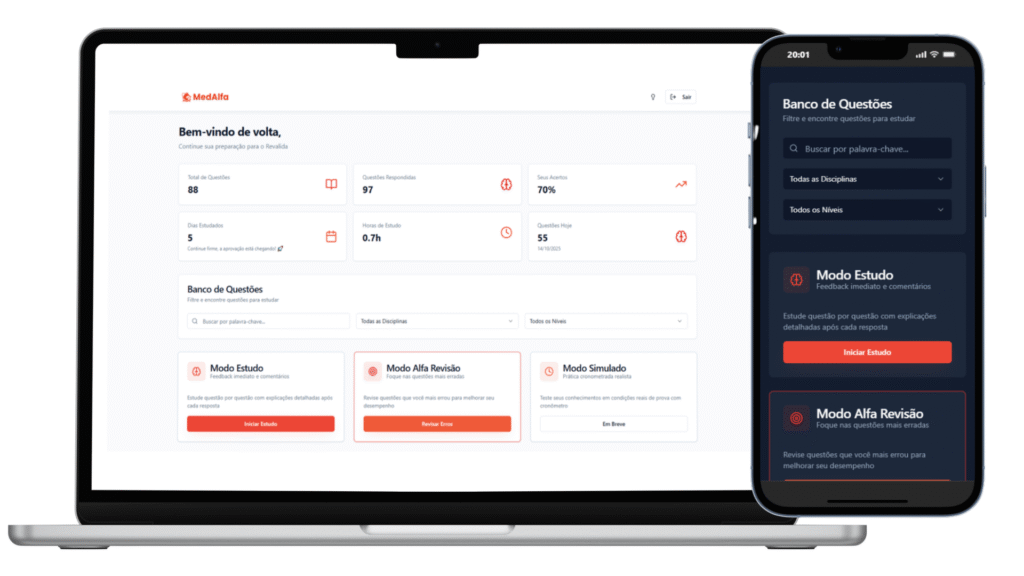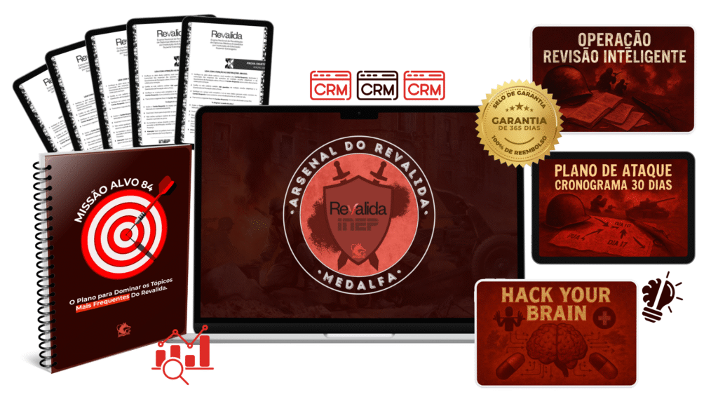 Leve o Arsenal do Revalida. Implemente a rotina de estudos, faça os simulados, acompanhe sua evolução no painel de métricas em Tempo Real.